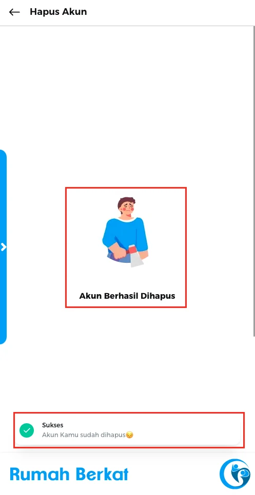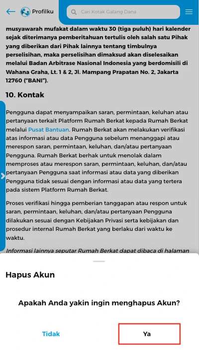 Konfirmasi penghapusan akun dengan klik tombol “ya”
