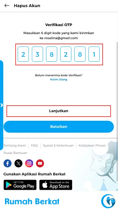 Masukkan 6 digit kode otp yang dikirimkan ke email anda, klik tombol “lanjutkan”
