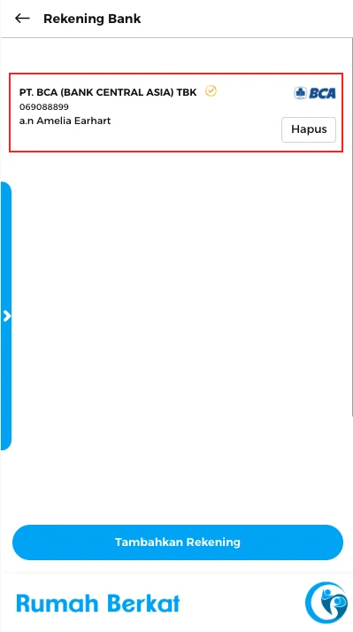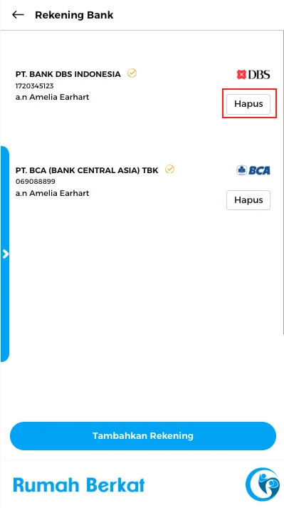 Pilih nomor rekening bank yang ingin anda hapus, lalu klik tombol “hapus’