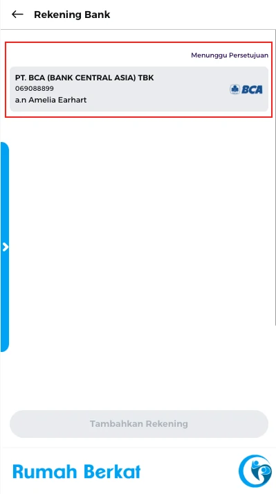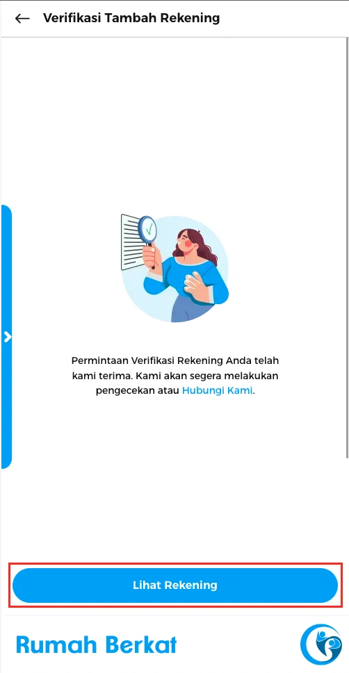 Pengajuan tambah rekening sedang dalam tahap validasi oleh admin, klik tombol “lihat rekening”
