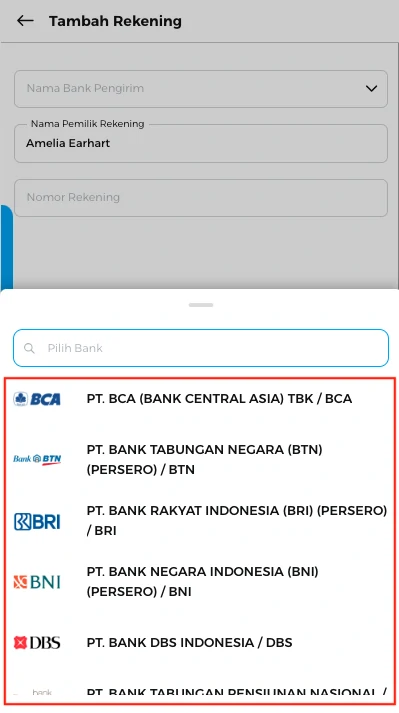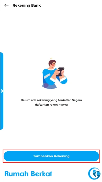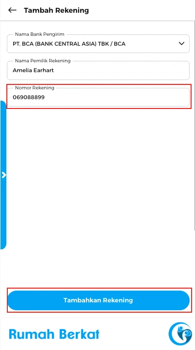 Masukkan nama dan nomor rekening bank anda, lalu klik tombol “tambahkan rekening”