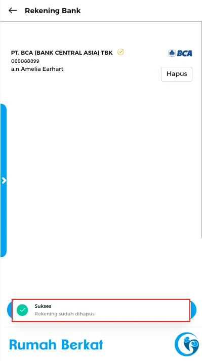 Rekening bank anda berhasil dihapus. Anda dapat menambahkan rekening kembali.
