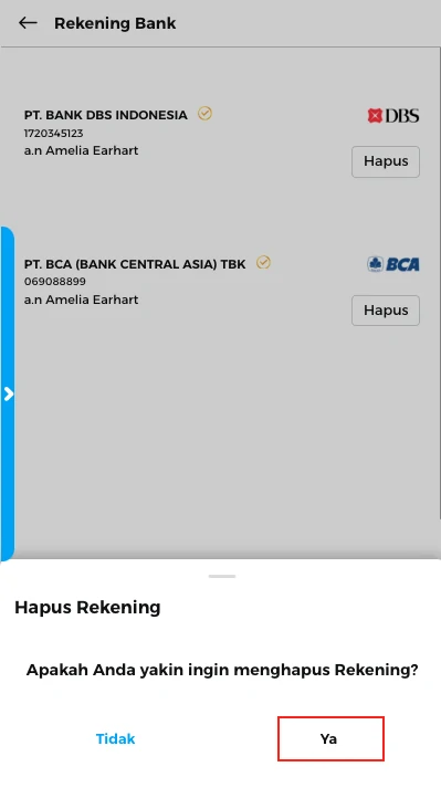Klik tombol “ya” jika yakin ingin menghapus rekening bank anda