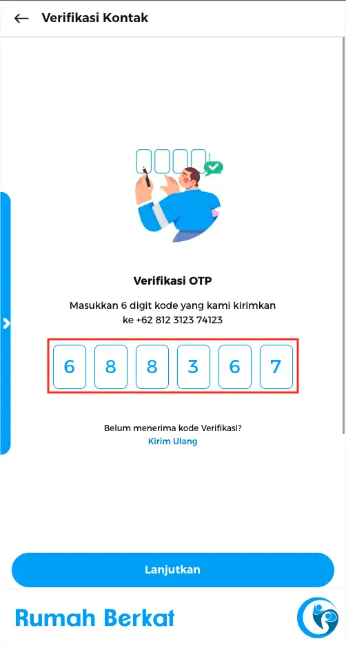 Masukkan 6 digit angka kode OTP yang dikirimkan ke nomor yang terdaftar di whatsapp anda, kemudian klik tombol “lanjutkan”