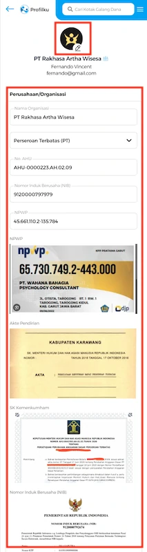 Dokumen yang diperlukan sesuai dengan jenis organisasi/perusahaan yang dipilih lihat disini