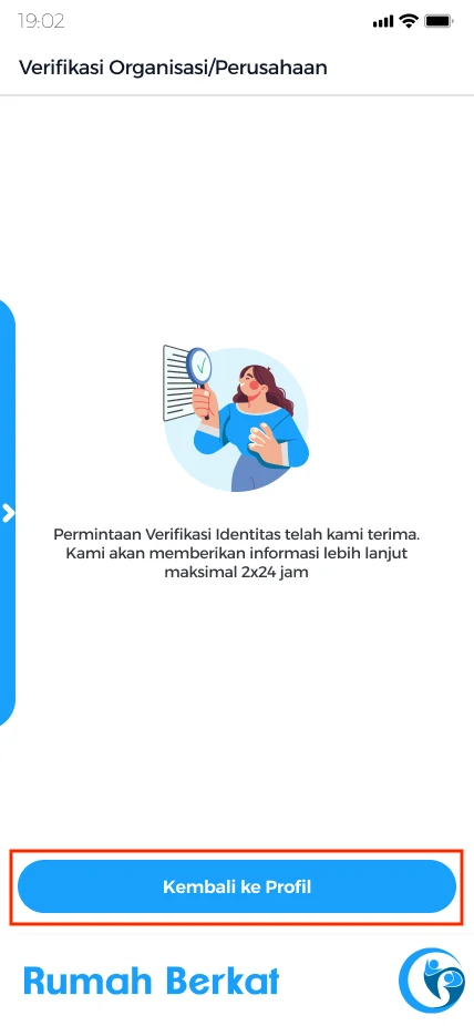 Verifikasi organisasi/perusahaan anda sedang dalam proses validasi oleh admin, klik tombol “kembali ke profil”